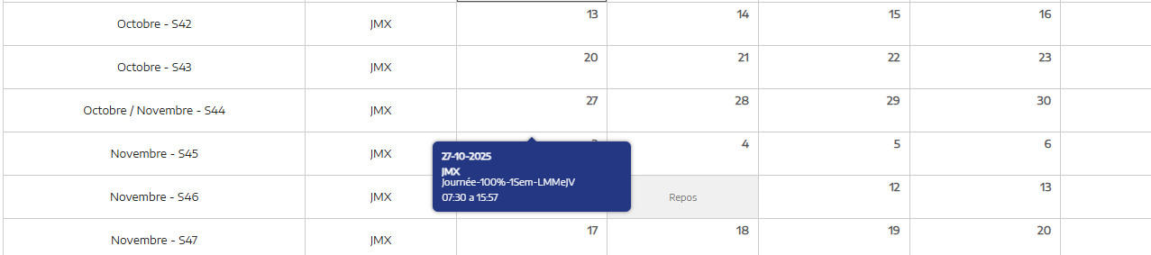 Pour connaitre vos heures, il faut aller sur le HUB dans MyTime, calendrier et balader la souris sur le calendrier, les heures de travail apparaissent :