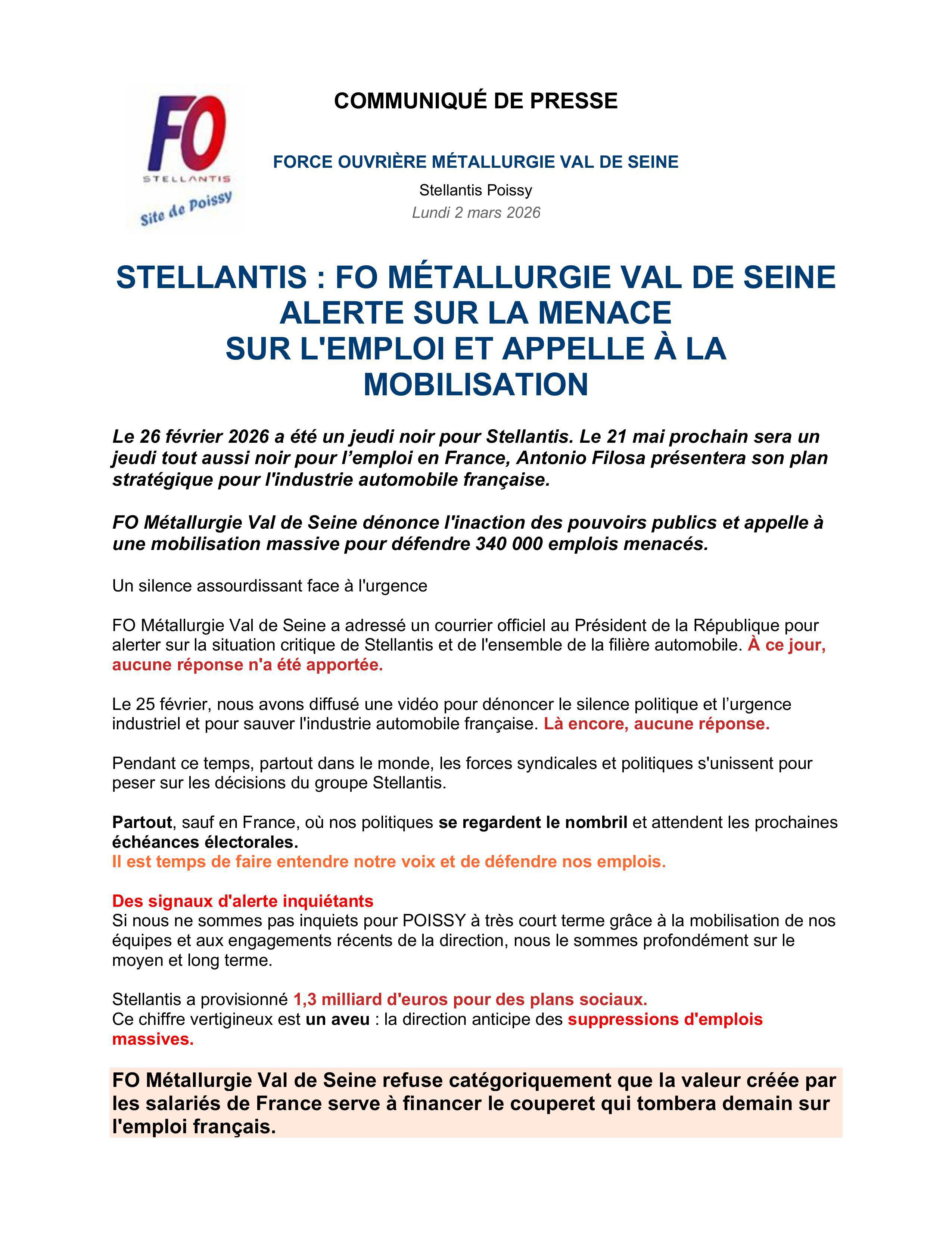 FO STELLANTIS a diffusé communiqué de presse pour alerter sur la situation critique de Stellantis et de toute la filière automobile.