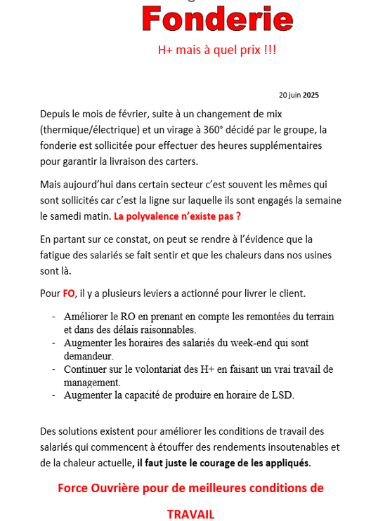 Pour FO, la direction va dans le sens d’une gestion plus logique et responsable. Le passage en volontariat sur les séances supplémentaires prouve qu’il FO faire confiance aux fondeurs pour accompagner le changement.