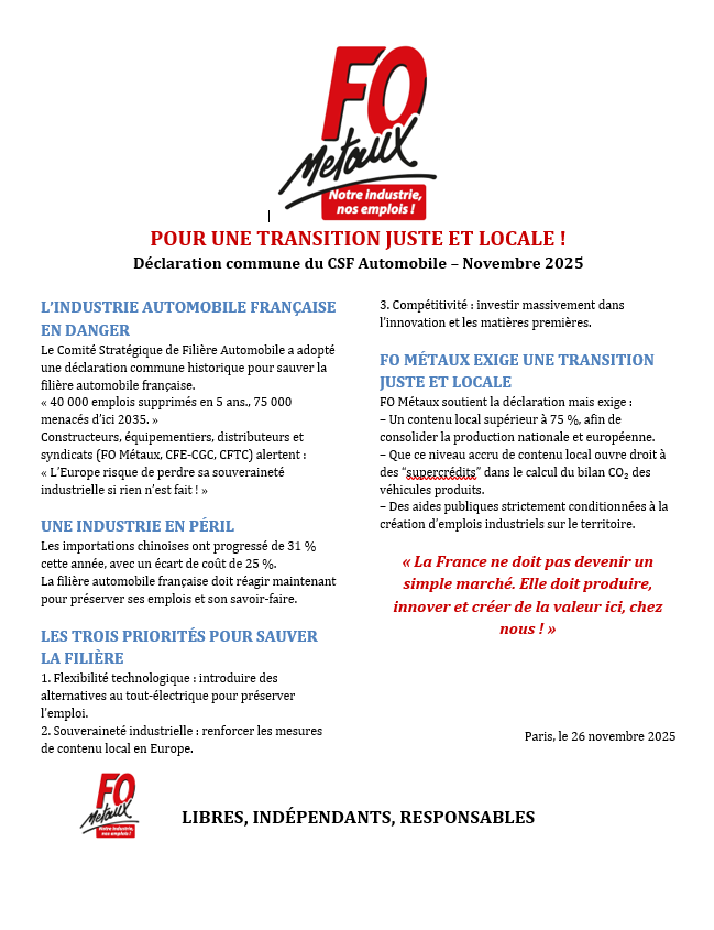 FO , fidèle à sa ligne réformiste, ne se satisfait ni des constats ni de l’attentisme. Nous croyons à l’action, à la responsabilité et au dialogue social constructif. Préserver l’emploi n’est pas une posture, c’est une stratégie. Elle exige que nous anticipions, plutôt que de subir des décisions prises ailleurs.