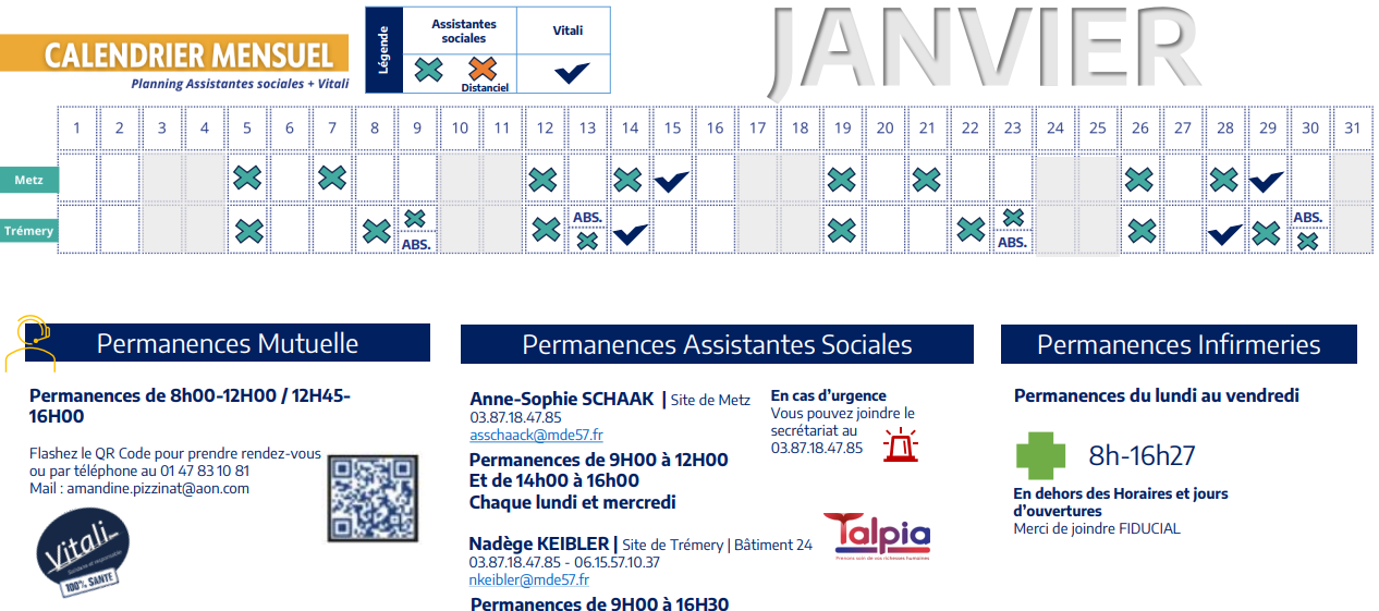 Calendrier des assistantes sociales et VITALI de janvier