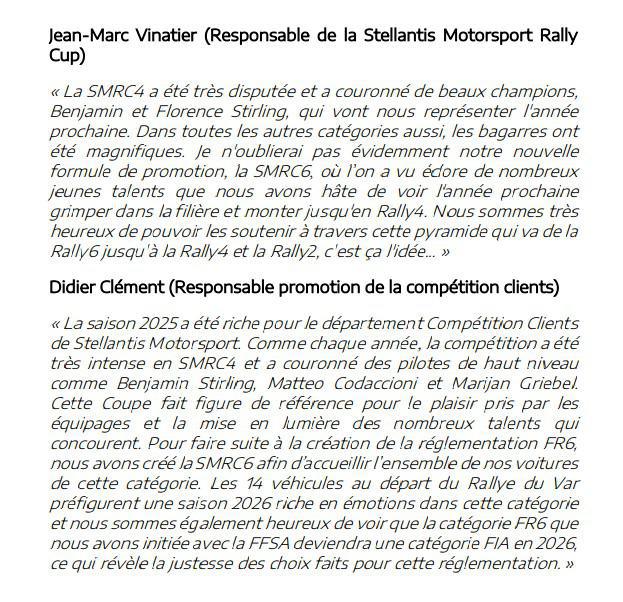 Cette année, Stellantis Motorsport a apporté de la nouveauté pour répondre à une large demande en proposant la Stellantis Motorsport Rally Cup en deux formules de promotion distinctes organisées dans le cadre des championnats de France des Rallyes asphalte et terre : la SMRC4 (Peugeot 208 Rally4, Opel Corsa Rally4, Lancia Ypsilon Rally4 HF) et la SMRC6 (Peugeot 208 Racing, Opel Corsa Racing, Lancia Ypsilon HF Racing).